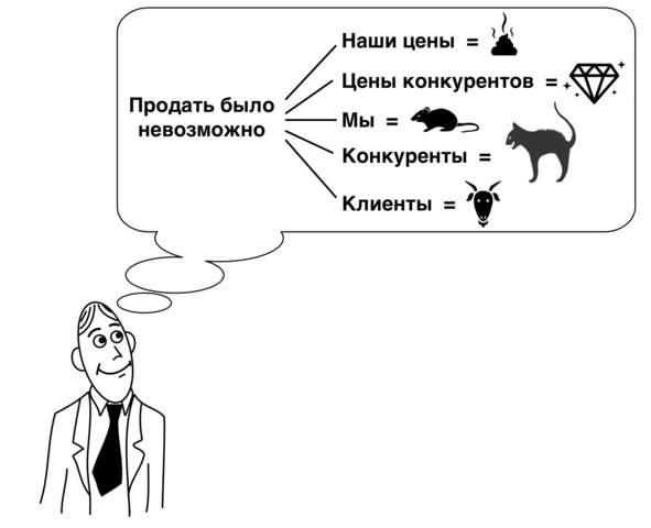 Все переговоры происходили в четком соответствии с теоремой Томпсона. Мелкий клиент задолго до переговоров сконструировал для себя ситуацию, в которой закупать брендовые товары и комплектующие невозможно. И все, что говорил ему менеджер по продажам, воспринимал сквозь призму этой виртуальной ситуации, превращая ее в реальную.