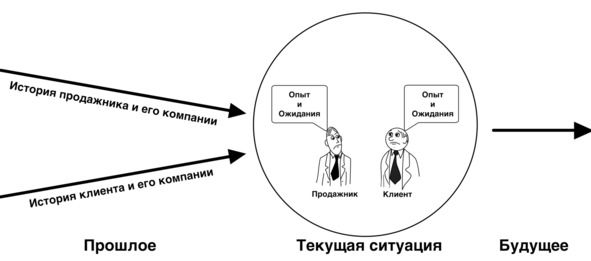 Таким образом, когда наш менеджер Вася приходит на переговоры, он ничего не начинает «с нуля». Он продолжает цепочку действий, существовавшую задолго до встречи. Даже если компания Васи никогда не работала с компанией клиента, ситуация взаимодействия началась задолго до очной встречи.