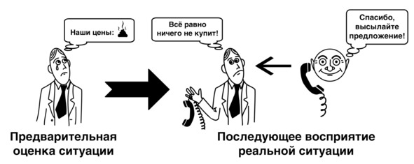 Потому, что Вася заранее решил за клиента, что его предложение не выгодно ни по ценам, ни по другим условиям. И, общаясь с реальным клиентом, смотрит на него через призму своего искаженного восприятия. Все сказанное и сделанное клиентом Вася использует для укрепления своего понимания ситуации. То есть любое поведения клиента Вася будет интерпретировать как отсутствие интереса и нежелание покупать.