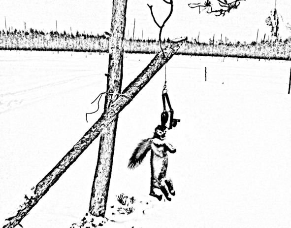 Для этого способа Илья вырубил три сухие жерди толщиной с руку, поднявшись чуть выше по натоптанной соболиной тропе, привязал проволочкой первую жердь к дереву наискосок под углом сорок пять градусов. Нижний конец воткнул поглубже в снег, притоптал как следует. В верхнем конце толстой палки сделал надрез ножом настолько, чтобы нижняя часть пружины капкана легко туда заходила, при этом держалась в этом расщепе надёжно. Далее капкан взводится в рабочее положение и устанавливается на жерди в расщеп, его цепь привязывается к этой наискосок расположенной палки так, чтобы попавшийся соболь повис на ней, не доставая до земли. Желательно подбирать специально такое место, чтобы возле установленного капкана в расщеп находилось мелкое деревцо или ветка, по которой зверьку трудно будет достать приманку. На это деревце с помощью тонкой мягкой проволоки крепится приманка, чуть выше капкана, так чтобы зверьку стоя на жерди с капканом приходилось тянуться к приваде.
