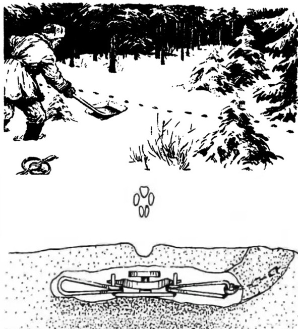 В полуметре от следа вырезал фанеркой квадрат снега, аккуратно убрав его в сторону. Той же самой фанеркой, выгребая снег, прорыл туннель под самим следом, создав пустоту под ним. На дно отверстия уложил лист бумаги, на него не спеша, чтобы не дай бог не обвалить след, положил взведённый капкан. Цепь капкана привязал к стоящему поблизости небольшому дереву за макушку, предварительно его наклонив. Чтобы дерево оставалось в таком же положении, вырезал из прутиков сторожок и закрепил его на кустарнике поблизости. Затем везде, где он прикасался к снегу, рыл его, установив куб снега на место, замёл веточкой ёлки, замаскировав свои следы.