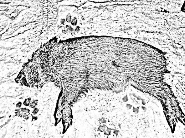 Приблизившись к крупному самцу секача, Илья замер, когда он шёл со спины кабана, ему не было видно, теперь же его взгляду открылась следующая картина – перед ним лежал убитый зверь с выпущенными наружу внутренними органами. Шея животного была разорвана, именно вырвана с куском плоти, а не перерезана ножом как это бы сделал человек. Сперва оглядевшись вокруг и не обнаружив опасности, Илья присмотрелся к следам вокруг, сразу приметив знакомый, вполне узнаваемый, но чересчур крупный след тигра – Амба, как его называют местные жители дальнего востока- нанайцы. Один отпечаток лапы был наиболее хорош, к нему и подошёл Илья. Испуганно оглянувшись вокруг, присел на корточки, чтобы разглядеть получше.
