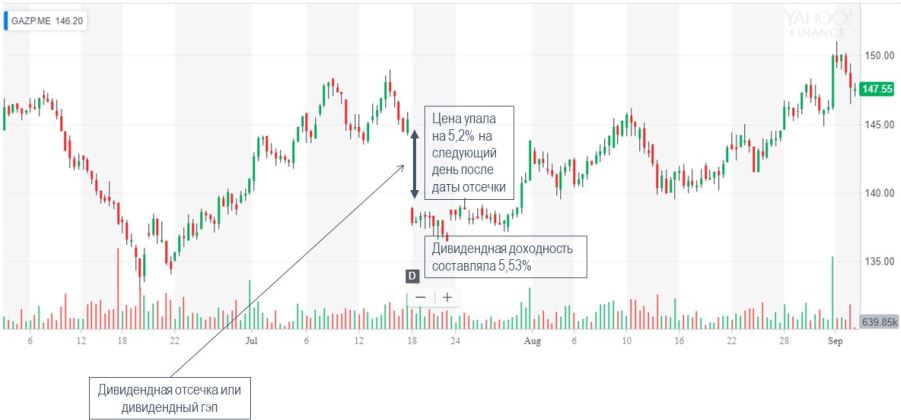 После закрытия реестра, на следующий день, спрос на покупку акции резко прекращается. В связи с этим наблюдается резкое падение цены акции на следующий день, вплоть до размера самих дивидендов. То есть, если дивидендная доходность 5%, то акция на следующий день может вполне просесть на эти же 5%, но не обязательно. Эта просадка в цене акций и называется дивидендной отсечкой или дивидендным гэпом.