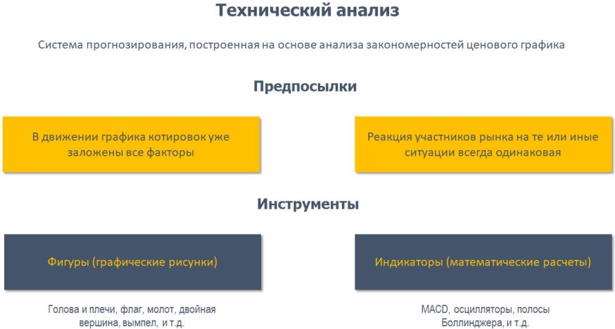 Технический анализ подразумевает собой систему прогнозирования, построенную на основе анализа поведения и закономерностей движения ценового графика. Этим он и отличается от фундаментального анализа, в котором упор делается на новости, макроэкономические либо корпоративные новости по самой компании. То есть по сути, с помощью теханализа трейдер может открывать и закрывать позиции, основываясь только на движении ценового графика, и он может быть совсем незнаком с деятельностью той компании, акции которой он покупает и продает. Поэтому, так как технический анализ не несет какой-либо информации о прибыльности бизнеса или его рентабельности, им часто пользуются краткосрочные трейдеры.