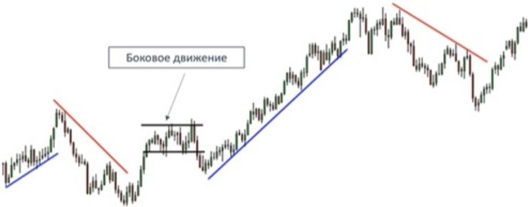 В противоположность трендовому рынку, есть рынки или отдельные акции, которые показывают боковое движение. Под боковым движением подразумевается, что акция уже долгое время торгуется в диапазоне между конкретными показателями и никак не может выйти за их пределы либо вниз либо вверх.