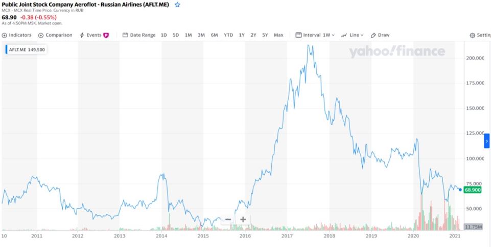 Посмотрим на Аэрофлот. С 2015 года по середину 2017 года был сильный бычий рынок, а с середины 2017 года такой же сильный медвежий рынок, и даже краткосрочные подъемы не помогли одолеть медведей.