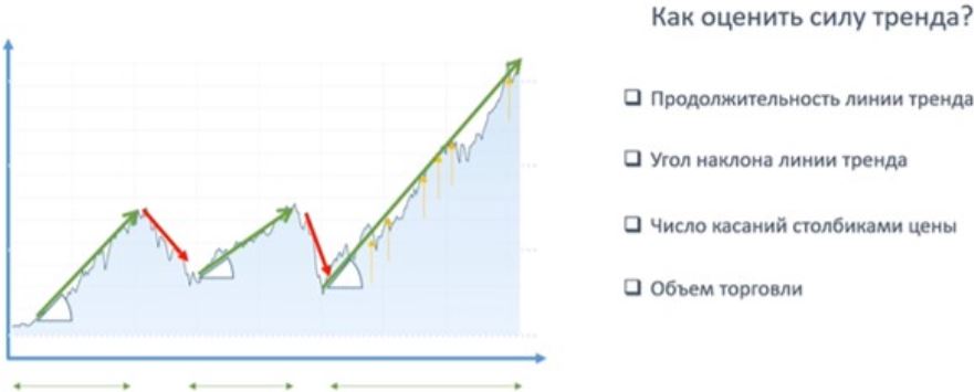 Как же оценить насколько силен тренд в той или иной акции? Ключевой здесь момент при анализе тренда – это его сила. Чем сильнее тренд, тем сложнее его сломать и тем выше вероятность его продолжения. Оценить силу тренда можно проанализировав такие параметры как: