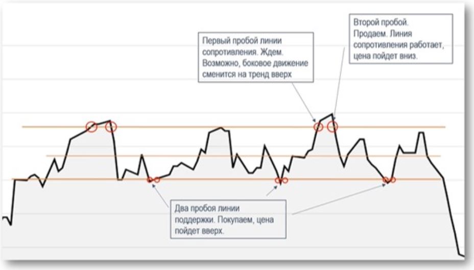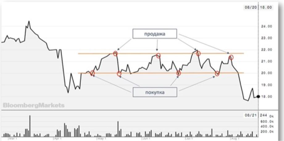 Боковое движение также можно использовать для прибыльной торговли. Так как вы понимаете, где проходят границы этого движения, вы можете покупать акции при соприкосновении с нижней границей и продавать их по достижению верхней границы.