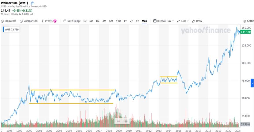Хороший пример, американский крупнейший ритейлер Walmart. Примерно с начала 2013 года до конца 2014 года на протяжении практически двух лет было боковое движение с отчетливыми линиями поддержки и сопротивления, потом был скачок вверх и далее сильный тренд вниз на протяжении года. Далее был тренд вверх с конца 2015 по середину 2016 года, потом опять небольшое боковое движение и потом долгий бычий рынок.