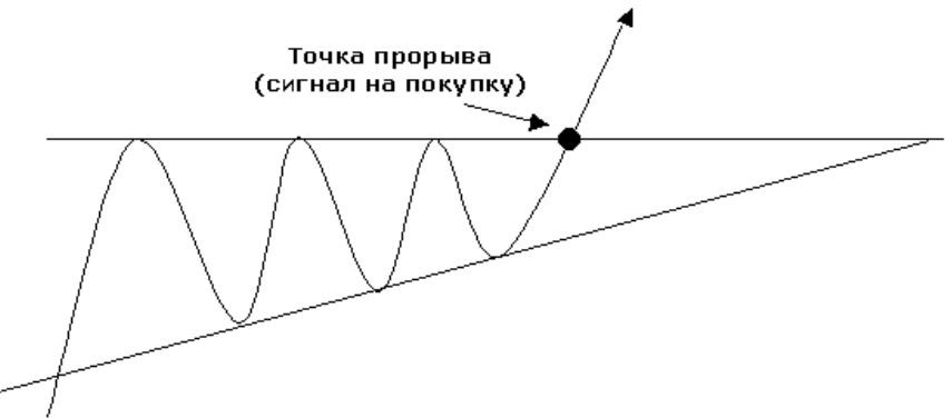 В восходящем треугольнике верхняя граница расположена горизонтально графику и образует линию сопротивления, а нижняя граница имеет восходящий наклон. Как правило, в результате формирования восходящего треугольника курс цены пробивает верхнюю линию и продолжает движение вверх, поэтому в таком случае можно открывать позицию на покупку.