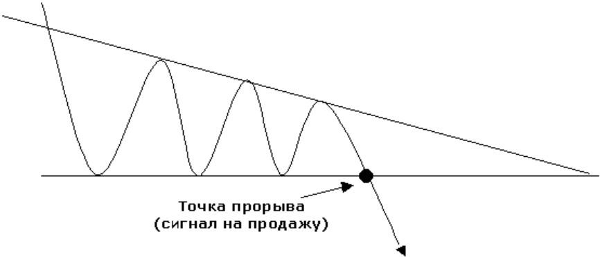 В нисходящем треугольнике нижняя линии образует горизонтальную линию поддержки, а верхняя линия треугольника имеет нисходящий наклон. Считается, что в большинстве случаев, при формировании нисходящего треугольника курс цены пробивает нижнюю границу и продолжает движение вниз, поэтому пробитие нижней границы может служить сигналом на продажу.