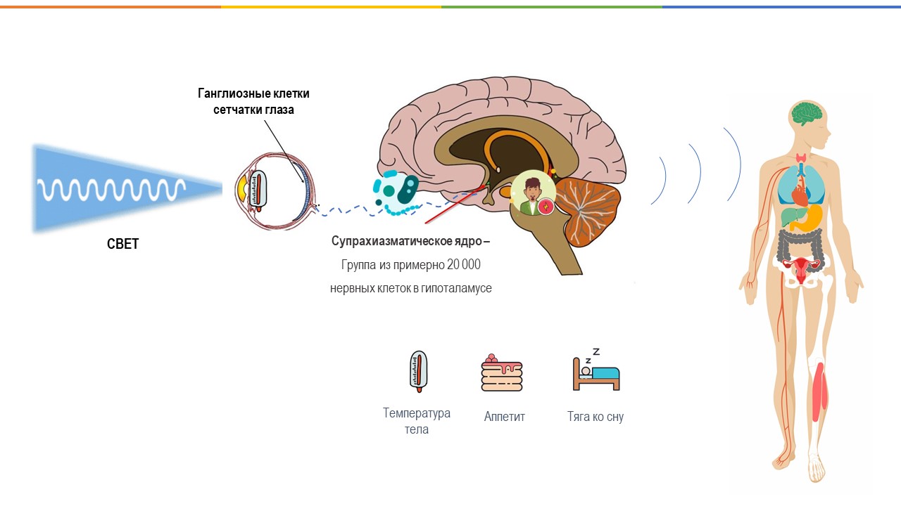 Каждое утро, когда проникает солнечный свет, температура нашего тела начинает повышаться и выделяется гормон кортизол, повышая нашу бдительность и заставляя просыпаться. Вечером, когда на улице темнеет, уровень гормона сна мелатонина повышается, а температура тела понижается. Уровень мелатонина остается повышенным в течение ночи, способствуя засыпанию и пребыванию в сне. Пока наши глаза воспринимают свет, SCN реагирует подавлением выработки мелатонина. Это объясняет, почему вечернее воздействие света, например, от внутреннего освещения или электронных устройств, излучающих синий свет, таких как компьютер, телевизор или мобильные телефоны, затрудняет засыпание.