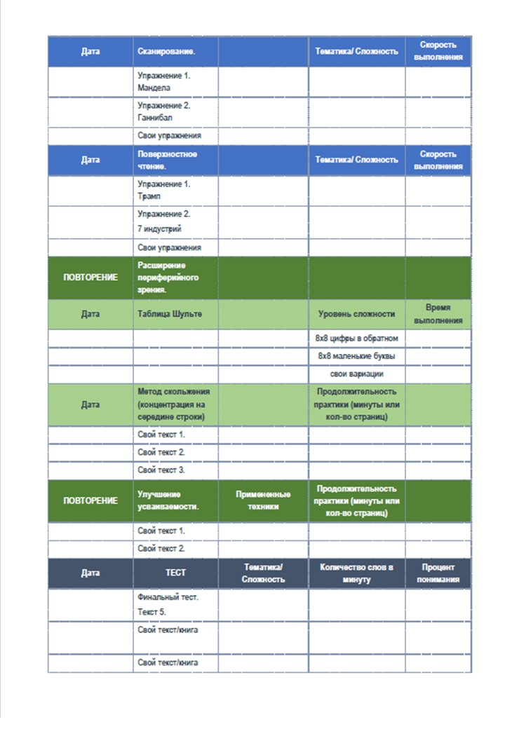 Для того, чтобы вы могли отслеживать свой прогресс заведите себе специальный Чек-лист, который вы можете заполнять во время прохождения данного курса. В него вы можете заносить результаты вашего начального, промежуточного и финального тестов на проверку скорости чтения, а также результаты тренировок по освоению тех или иных приемов.