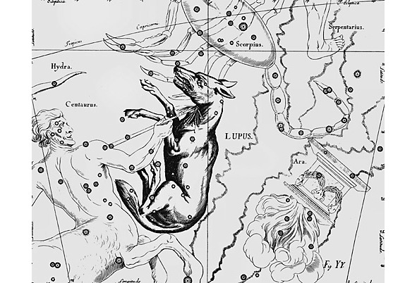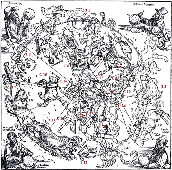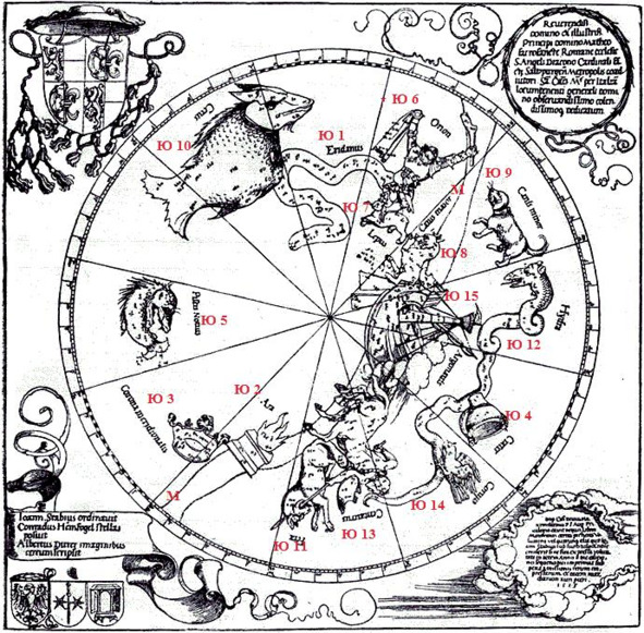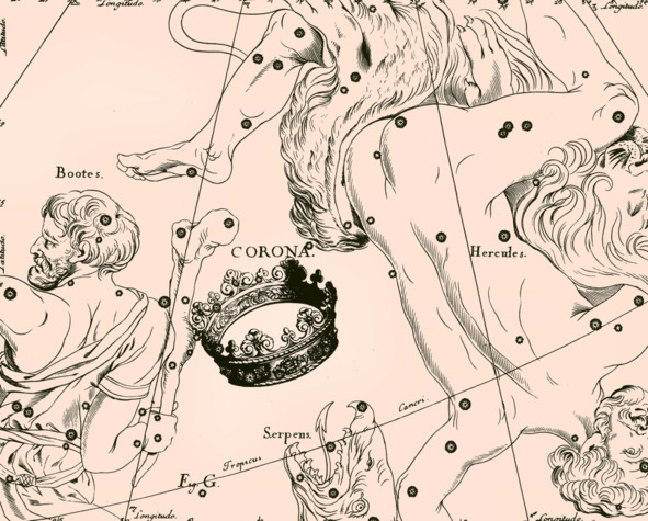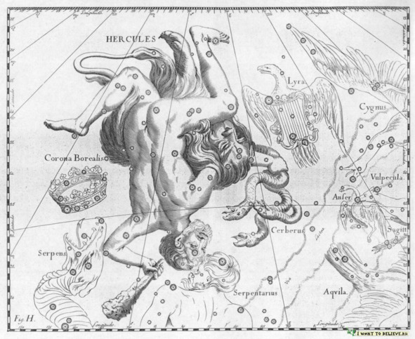 Слева созвездие Волопас (Bootes) с дубиной в руке, справа созвездие Геркулес (Hercules). Снизу созвездие Змея (Serpens), разевающая пасть на созвездие Северная Корона. Пасть Змеи пересекает Тропик Рака (Tropicus Canceri).