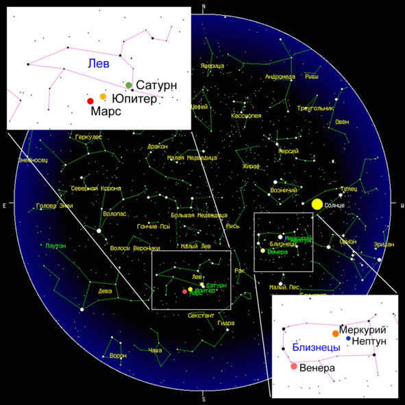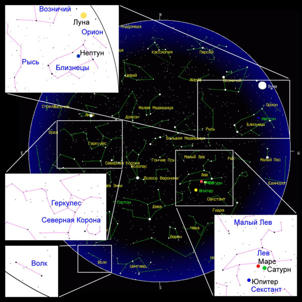 Во Льве показался бледно-зелёный Сатурн, ниже которого ярко сверкал огненно-красный Марс. Когда Лев поднялся выше половины, в нём вспыхнул ослепительно-белый Юпитер. Три планеты находились очень близко друг от друга. Ясная Луна, приближаясь к ним, покинула рога Тельца и входила в Близнецы.
