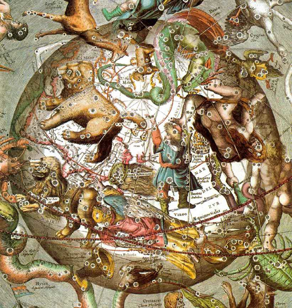 Созвездия под Цербером ворочаются, опускаясь нижней частью за горизонт, как бы прикрывая верхним боком нижний, в предвкушении мук Ада. Чуть ниже созвездия Большая Медведица находится созвездие Гончие Псы [Рис. А VI.2] (воют, будто суки), введённое на Звёздное Небо Яном Гевелием.
