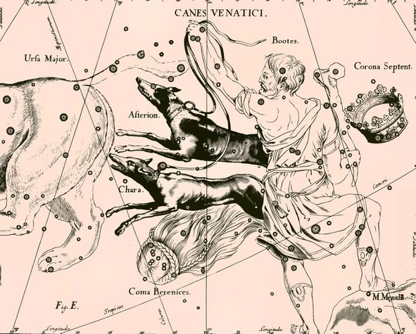 Пояснения к иллюстрации. Двух Гончих Псов – Астериона (Asterion) и Чару (Chara) держит на сворке знаменитый охотник – созвездие Волопас (Bootes) или Страж Медведиц (Arctophilax) – бородатый, в прекрасной тунике и поножах хранитель Северной Короны. Ярчайшая звезда созвездия Волопас – переменный красный гигант Арктур располагается на подоле туники. Псы гонят созвездие Большая Медведица (Ursa Major), под ними созвездие Волосы Вероники (Coma Berenices). Ясно виден Ковш Большой Медведицы от кончика длинного хвоста (загадка изображения Медведиц, не имеющих хвоста, на Звёздных Картах). Волопас наступает ногой на созвездие Гора Менала (Mons Menalis), справа от него созвездие Северная Корона (Corona Serpent). Большая звезда в ошейнике Чары носит название Сердце Карла (Cor Caroli). Гончие Псы и Гора Менала введены Яном Гевелием. Ноги Волопаса пересекает Тропик Рака (Tropicus Canceri).