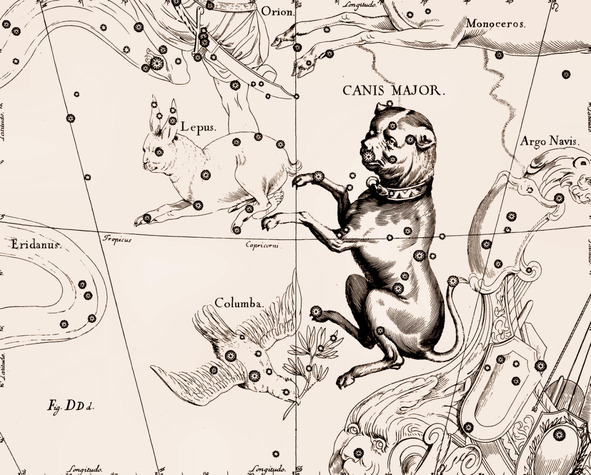 А.I.9 Созвездие Большой Пёс (CANIS MAJOR) из Атласа «Uranographia» Яна Гевелия 1690 года. Слева вверху созвездие Орион (Orion) с огромным мечом на поясе, справа вверху созвездие Единорог (Monoceros), слева созвездие Заяц (Lepus), созвездие Эридан (Eridanus), созвездие Голубь (Голубка) (Columba). Справа созвездие Корабль Арго (Argo Navis). Созвездия Единорог и Голубь введены Яном Гевелием.
