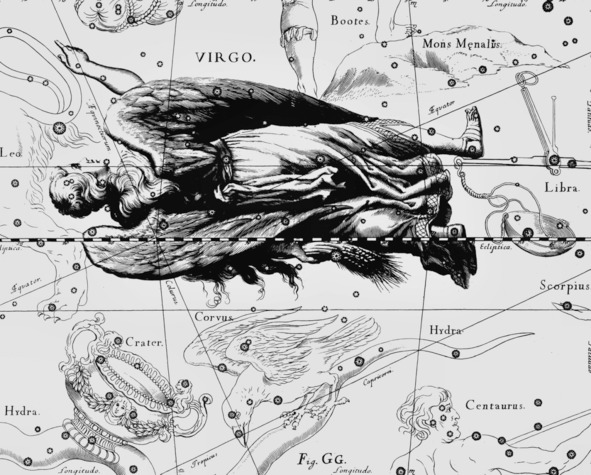 Пояснения к иллюстрации. Вверху созвездие Волосы Вероники, называемое иногда Платок Святой Вероники (по легенде, на нём отпечатался облик Христа – Спас Нерукотворный), созвездие Волопас (Bootes), опирающийся ногой на созвездие Гора Менала (Mons Menalus), ныне не существующее. Слева Зодиакальное созвездие Лев (Leo). Справа Зодиакальное созвездие Весы (Libra), ранее называемое Клешни Скорпиона, под ним – клешня созвездия Скорпион (Scorpius). Внизу созвездие Гидра (Hydra), созвездие Чаша (Crater), созвездие Ворон (Corvus), созвездие Центавр (Centaurus). Дева изображена в виде Ангела с огромными крыльями, лежащей выше Эклиптики (Ecliptica), под которую спускаются часть её крыла, рука с Колосом, в котором находится ярчайшая звезда созвездия – Спика и часть ноги в роскошной сандалии. Облачена в роскошное платье, подвязанное Поясом.