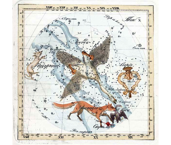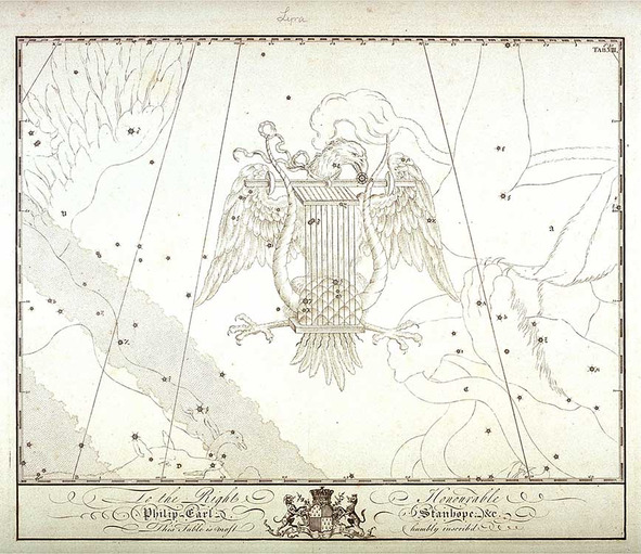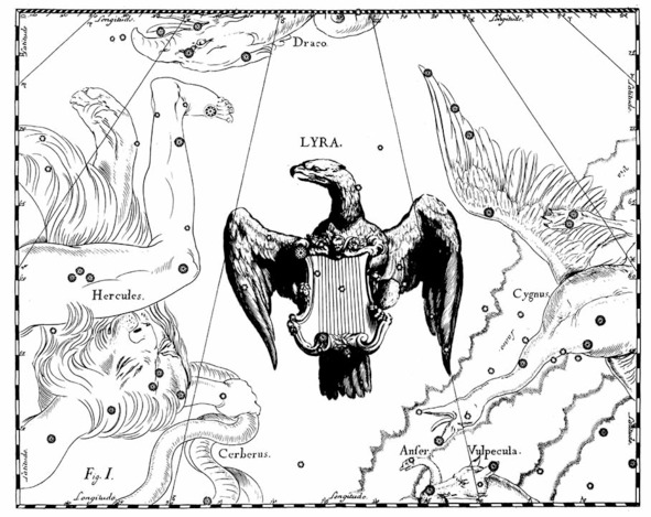 А. IV.4 Созвездие Лира (LYRA) из Атласа «Uranographia» Яна Гевелия 1690 года. Сверху созвездие Дракон (Draco), слева созвездие Геркулес (Hercules), попирающее ногой голову Дракона, в руке у Геркулеса Цербер (Cerberus). Справа созвездие Лебедь (Cygnus), ниже него созвездие Лисичка (Vulpecula) с Гусем (Anser) в зубах. Как считается, на карте Гевелия изображен коршун, держащий в лапах Лиру, однако сама Лира изображена без ясного представления об этом инструменте – непрозрачная, как щит. Зато сам коршун во фронтальном изображении удивительно похож на двуглавого орла без одной головы. Хвост птицы не имеет характерного для коршунов «ласточкина» выреза.
