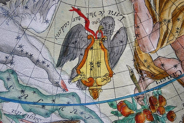 А. IV.5 Созвездие Лира в атласе Иоганна Байера. Лира изображена со знанием дела, сквозь струны виден силуэт птицы. Изображение ещё больше похоже на двуглавого орла – шея головы, наклоненной вправо, смещена влево, вместо второй головы изображена завязка, держащая Лиру на шее птицы (у Яна Гевелия коршун держит Лиру в лапах). Изображение более раннее, чем у Гевелия.