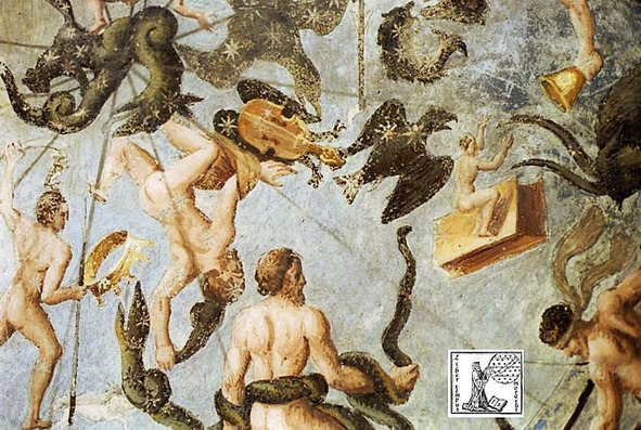 А. IV.9 Созвездие Лира на росписи Палаццо Беста. Явно изображен двуглавый орёл без голов, на груди которого размещена скрипка, скрывающая и хвост. Художник, изображая двуглавого орла, униженного и сгорающего от стыда, показал его, спрятавшим за скрипку обе головы. В руке созвездия Геркулес нет ничего, в руках созвездия Волопас изображены кривой меч и копьё. Созвездие Орёл изображено с хвостом коршуна, имеющем вильчатый вырез.