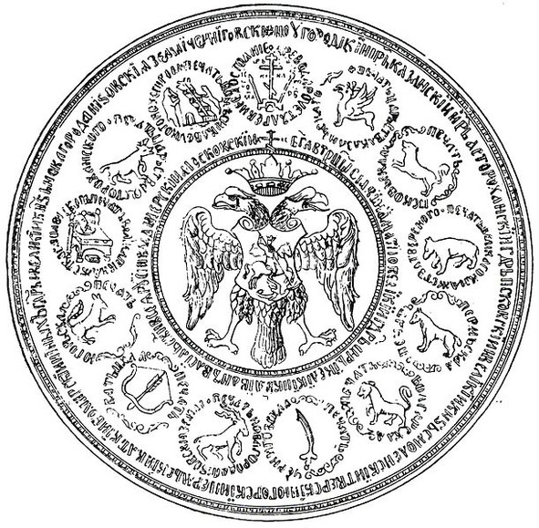 Двуглавый Орёл в Гербе Византии [Рис. А. IV.12] традиционно изображается с мечом, скипетром и державой в лапах – руках, а Двуглавый Орёл на печати царя Иоанна III Васильевича Великого и Грозного [Рис. А. IV.13] без меча и скипетра; глядя на него ясно, что служит моделью для созвездия Двуглавый Орёл, переделанного затем в созвездие Лира. Вот где искомые меч в руках и сияющее величие – созвездие является имперским символом!