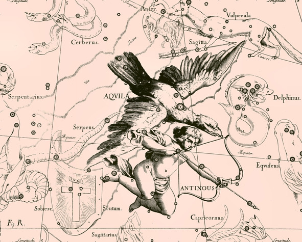 Пояснения к иллюстрации. В лапах Орла созвездие Антиной (Antinous) или Ганимед, натягивающий лук со стрелой. Сверху Цербер (Cerberus) в руке созвездия Геркулес, далее созвездие Лисичка (Vulpecula) с Гусем (Anser), под ней созвездие Стрела (Sagitta). Слева созвездие Змеедержец (Serpentarius) и созвездие Змея (Serpens) в его руках, хвостом к Орлу, под ним созвездие Щит Собесского (Sobiesc. Scutum), справа созвездия Дельфин (Delphinus) и Малый Конь (Eqvuleus). Внизу созвездие Стрелец (Sagittarius) и созвездие Козерог (Capricornus), над которым видна рука созвездия Водолей. Хвост Орла находится в Млечном Пути (Via Lactea), грудь Антиноя пересекает экватор. Самая яркая звезда Орла – Альтаир (глаз Ястреба)