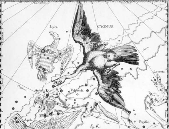 А. IV.15 Созвездие Лебедь (CYGNUS) из Атласа «Uranographia» Яна Гевелия 1690 года. Слева созвездие Лира (Lyra) (соседнее с ней созвездие Геркулес не изображено). Внизу созвездие Лисичка (Vulpecula) с Гусем (Anser), Созвездие Стрела (Sagitta) и созвездие Орёл (Aqvila), справа внизу созвездие Ящерица Lacerta) и копыта созвездия Пегас (Pegasus). Группа созвездия располагается вдоль Млечного Пути (Via Lactea).