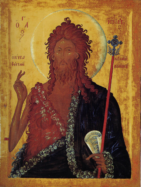 Е.1.4. Иоанн Креститель. Македонская икона. Иконописно изображается похожим на Илью пророка, с наброшенной на плечи шубой мехом внутрь.
