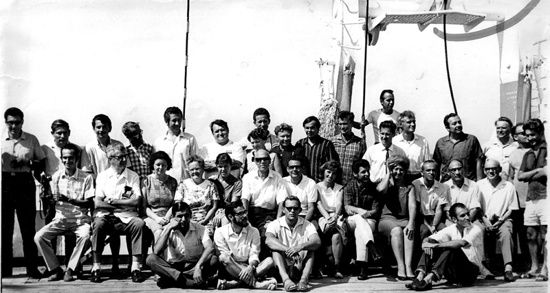 Фото 1. Участники рейса: (слева – направо). Сидят: Пабло дон Рамирес, третий – М. Казарновский. Второй ряд: второй – Пабло де ля Фуэнте, представитель ФАО, 4-ая – судовой врач, 6-й – директор, нач. рейса А. С. Богданов, 8-я – Буркальцева, 10-я – Любимова, 11 – Акъюз (ФАО), 12 – Гершанович. Третий ряд: 4-й – Богданов (ученый секретарь), 6-й – А. Петухов (капитан), 7-я – Михлина, 8-й – В. Быков, 10-й – Б. Иванов, 11-й – Щербино, 12-й – Ю. Тимофеев.