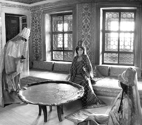 Описания гаремных покоев оставили и иностранные дамы, которым выпала удача посетить эти запретные для большинства палаты. Один из таких рассказов приводит Д. Дорис: «В апартаментах принцесс имеются разного рода салоны для собраний, и я имела возможность достаточно подробно осмотреть их обстановку во время моего посещения. Это было летом: белое полотно полностью закрывало начищенный дубовый паркет. Тут и там стояли софы, накрытые красным и желтым сатином, отороченным золотой бахромой; кресла и диванчики окружали полированный стол, инкрустированный слоновой костью. Восточная мебель соседствовала с тумбой эпохи Людовика XV. Стены были увешаны картинами (в основном пейзажами), обрамленными турецкими надписями, сделанными золотыми буквами по черному бархату. Расписной потолок изображал виды Босфора. Вход был замаскирован роскошной портьерой, на розовом фоне которой выделялась султанская тугра (монограмма Султана)».