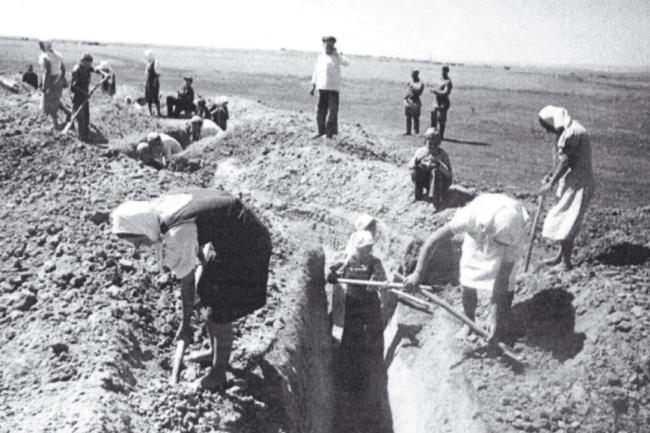 Приходилось наступать на неё двумя ногами и попрыгать, только тогда лопата входила в землю. Но ни усталости, ни боли уже не чувствовалось, единственная цель двигала всеми – преградить путь врагу во что бы то ни стало, уберечь свой дом и детей, копать, копать окопы. И мирное население делало это с особым остервенением, не жалея себя.