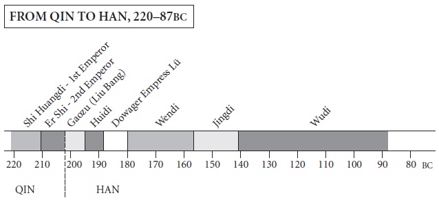 Sima Qian deals with this confused period exhaustively, recounting the marches and counter-marches, the engagements and intrigues in remorseless detail, but always from the perspective of the contending ‘rebel’ camps, not of the blood-spattered Qin court at Xianyang. Larger-than-life personalities emerge from the mêlée and hint at major issues. What might otherwise have seemed like a brief and belated throwback to the ‘Warring States’ period is portrayed as a seminal moment, a historical watershed and a Grand Historian’s grand opportunity. China’s political future was being decided and its official ideology forged. The Han empire that resulted would enshrine features of Chinese culture that would be revered ever after and lend compelling substance to the idea of a continuous civilisation.