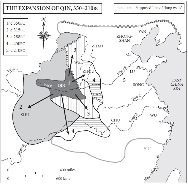 In practice it may have been that not all these measures were Shang Yang’s. Some may have been awarded him posthumously by the backdating beloved of historians. And they may not have been as harsh as they are portrayed; discrediting Qin and its policies would be a priority of the subsequent Han dynasty, during whose long ascendancy Qin’s history would be compiled. The reforms were nevertheless sensationally effective. Besides again ravaging Wei state, in 316 BC Qin’s forces swept south over the Qinling mountains into Sichuan and thus, as will be seen, secured a vast new source of cereals and manpower plus some important strategic leverage over Chu. During the last century of the ‘Warring States’ (c. 320–220 BC) Qin was more than a match for any of its rivals. It largely dictated the ever shifting pattern of alliances and it initiated about forty of the sixty ‘great power wars’ recorded for the period.