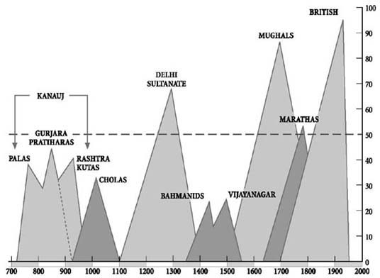 As with the forests and wetlands, the dry-lands were not without their own sparser populations, typically herdsmen and warriors. As barriers, dry regions are hardly as formidable as the seas and mountains of Europe. But as boundaries and frontier zones they did have something of the same effect, encouraging separation, fostering distinction and, in time, confronting ambitious rulers with the great Indian paradox of a land that invited dominion full of lesser rulers who felt bound to resist it.