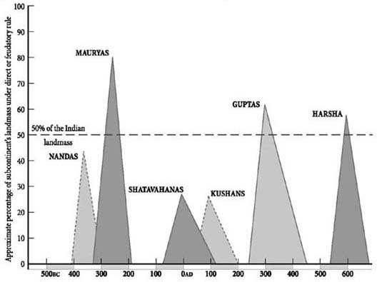 North India’s mighty river systems ordained much the most extensive of these well-watered zones of agricultural settlement; and though these zones were several, in the course of the first millennium BC they tended to become contiguous, thus creating a corridor of patchy cultivation and settlement from the north-west in what is now Pakistan to Bihar in the east. Here commercial exchange, cultural uniformity and political rivalry got off to an early start. The corridor became a broad swathe of competing states, cherishing similar ideals, revering common traditions and inviting claims of paramountcy. For empire-builders like the Mauryas, Guptas and Vardhanas, this was where the idea of Indian dominion began.