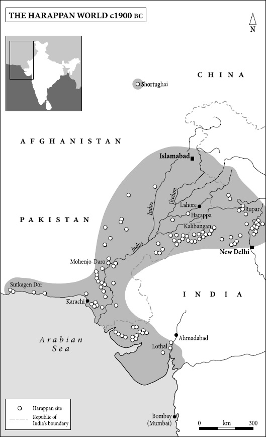 Another flood, later than the Sumerian one but much earlier than that at Hastinapura and so perhaps a serious contender for the one which Manu survived, is thought by some to have once inundated the plains of the lower Indus in what is now Pakistan. Geologists date it to some time soon after 2000 BC, and believe that it may in fact have been a succession of inundations. Whether they were the result of climate change, of tectonic action lower down the river resulting in damming and the formation of inland lakes, or simply the cumulative effect of annual siltation is not clear. But whatever the cause, the floods were bad news for those agriculturalists who had pioneered a highly productive economy based on growing cereals in the fine soil alongside the river. Managing the river’s seasonal rise so as to enrich and irrigate their fields was the key to their success. An annual surplus had generated wealth, encouraged craft industries and fostered trade. Settlements had become cities. Along the lower Indus and its tributaries had grown up one of the world’s first urban societies, a contemporary of those on the Nile and the Euphrates and a rival for the tag of ‘the cradle of civilisation’.