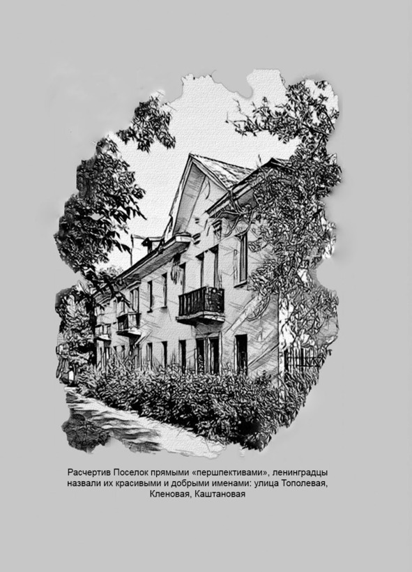 Расчертив Поселок прямыми «першпективами», ленинградцы назвали их красивыми и добрыми именами: улица Тополевая, Кленовая, Каштановая, Правды (не имени сановной большой газеты, а просто – правды). На улицах появились 2-этажные дома на восемь отдельных квартир с паркетом, газом и ваннами. Квартиры были небольшими, поэтому ванны устанавливали прямо в кухнях. Под окнами, словно привет из Летнего сада, добротно обосновались семейные палисадники. Уже не прежние укропно-морковные грядки (блокадные и спасительные), но целые цветники, которые охорашивали старую поселковую палитру крупными мазками гладиолусов, каплями георгинов и многоточием турецкой гвоздики.