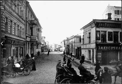 А если не отвлекаться на двух милиционеров, бегущих по трамвайным путям, за ними хорошо просматриваются под козырьком один из двух парадных входов в дом № 17 и далее два человека перед многообещающей вывеской ВИНА.