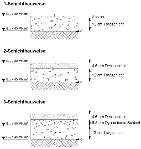 Zu beachten ist, dass bei Zwei- und Dreischichtbauweisen durch Frostaufgang und Nässe eine Aufweichung der Deckschicht auftreten kann, was die Nutzung in dieser Zeit beeinträchtigt (