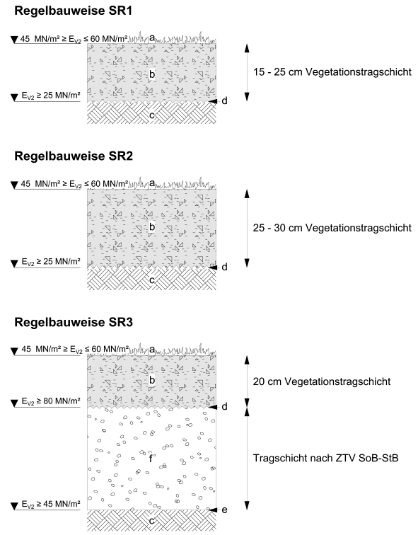 aBewuchsbVegetationstragschichtcBaugrunddVerzahnung 5 cmePlanumfTragschicht nach ZTV SoB-StBDer Baugrund muss einen kf-Wert ≥ 1x10-6 m/s und ein Verformungsmodul Ev2 ≥ 25 MPa ≤ 60 MPa aufweisen. Für hohe Belastungen ist eine Tragfähigkeit von mind. 45 MPa erforderlich. Je nach Verkehrslast muss auf den Baugrund eine Schottertragschicht aufgebracht werden.