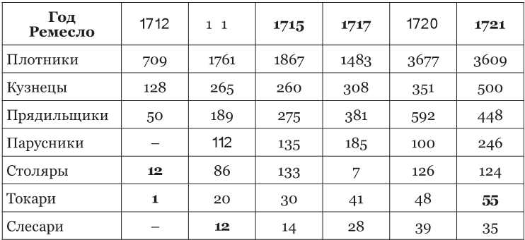 Ниже указаны некоторые типичные ремесленные профессии, занятых на крупнейшем мануфактурном производстве города, но в их списках, например, за 1717 г., находятся и такие профессии, как архитектор, лекарь, живописный мастер, толмач или музыкант, которые сегодня мало ассоциируются с ремеслом729. За 1715 г. и 1721 гг. из общего числа нами вычтены соответственно 12 и 20 живописцев. Между 1712 и 1721 гг., по отдельным ремеслам, количество плотников увеличивается с 709 до 3609 человек, кузнецов – со 128 до 500 человек, столяров – с 12 до 124 человек, токарей – с 1 до 55 человек, слесарей – с 0 до 35 человек, котельников – с 2 до 43 человек, медников – с 0 до 24 человек (см. таб. 1).
