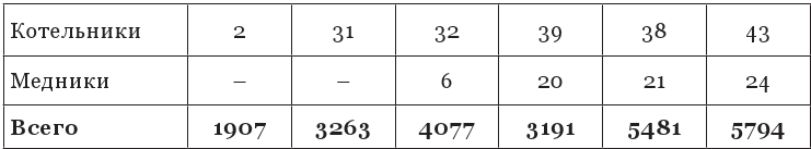 В последний год жизни Петра I и после его смерти количество специалистов в Главном Адмиралтействе резко падает. По сведениям И. К. Кирилова за 1724–1726 гг. среди адмиралтейских мастеровых на службе состояли 51 мастер, 45 подмастерьев, 99 учеников и 3892 рядовых, а всего 4087 человек734. Из числа рядовых можно вывести дозорщиков (6), помощников (17), толмачей (4), камендоров (18), у магазинов работников (312) и лоцманов (25), за вычетом которых остается 3705 рядовых (ремесленников). Соответственно общее число 3900 человек мы можем поделить на две части. К первой части относятся 195 «специалистов»–ремесленников: мастеров, подмастерьев и учеников, организованных по принципу иерархии в ремесленных цехах, ко второй – 3705 простых ремесленников. Если такое сокращение произошло уже при жизни Петра I, можно предположить, что это связано, прежде всего, с завершением Северной войны735.