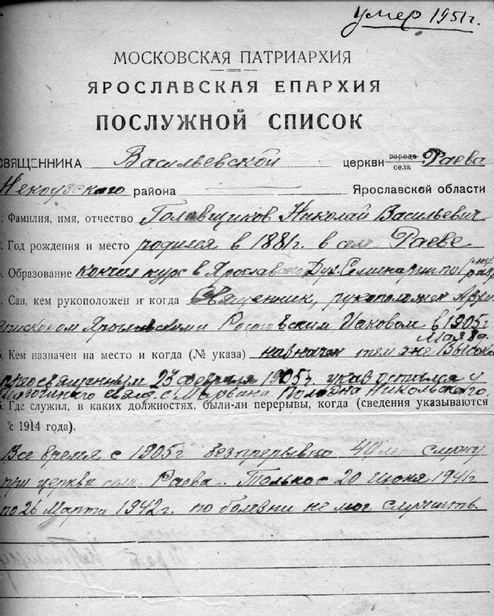 Послужной список священника Васильевской церкви села Раёва Некоузского района Ярославской области Головщикова Николая Васильевича.