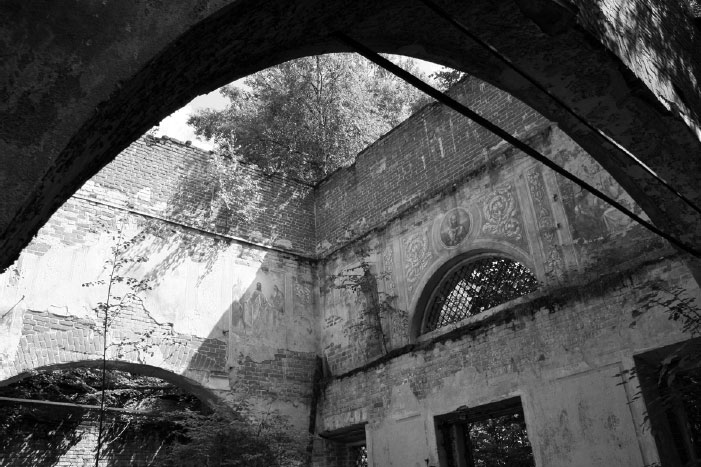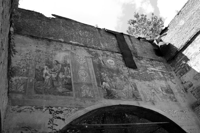В 90-х годах у церкви обвалилась крыша – купол рухнул внутрь здания. Сейчас войти туда нельзя: все завалено обломками деревянных перекрытий и железом купола. Заглядывая внутрь, поражаешься, как могла до сих пор сохраниться роспись на стенах – ведь над ними открытое небо?!! Год за годом идут дожди, падает снег, палит солнце… А изображения святых на голубых стенах продолжают внушать благоговение, и тянется рука – перекреститься.