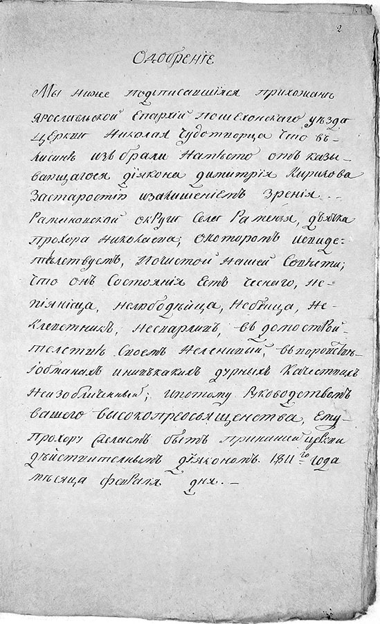 Сохранился типографский бланк «Присяги производимого в диакона», подписанный собственноручно дьячком Прохором Николаевым в 1811 году.