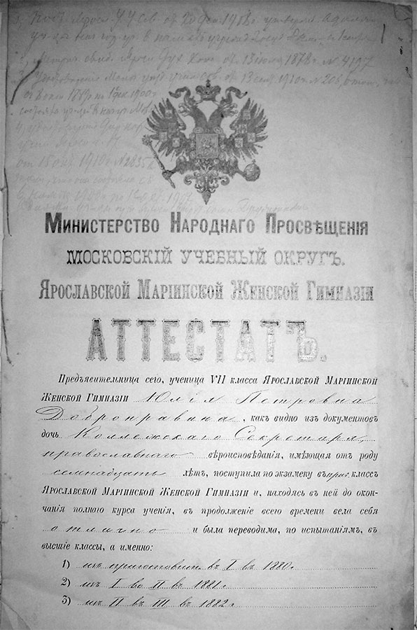 «Ярославской Мариинской Женской Гимназии Аттестат. Предъявительница сего, ученица VII класса Мариинской Женской Гимназии Юлия Петровна Добронравина, как видно из документов дочь Коллежскаго Секретаря, православного вероисповедания, имеющая от роду семнадцать лет, поступила по экзамену в приг(отовительный) класс Ярославской Мариинской Женской Гимназии и, находясь в ней до окончания полнаго курса учения, в продолжение всего времени вела себя отлично и была переводима, по испытаниям, в высшие классы…»