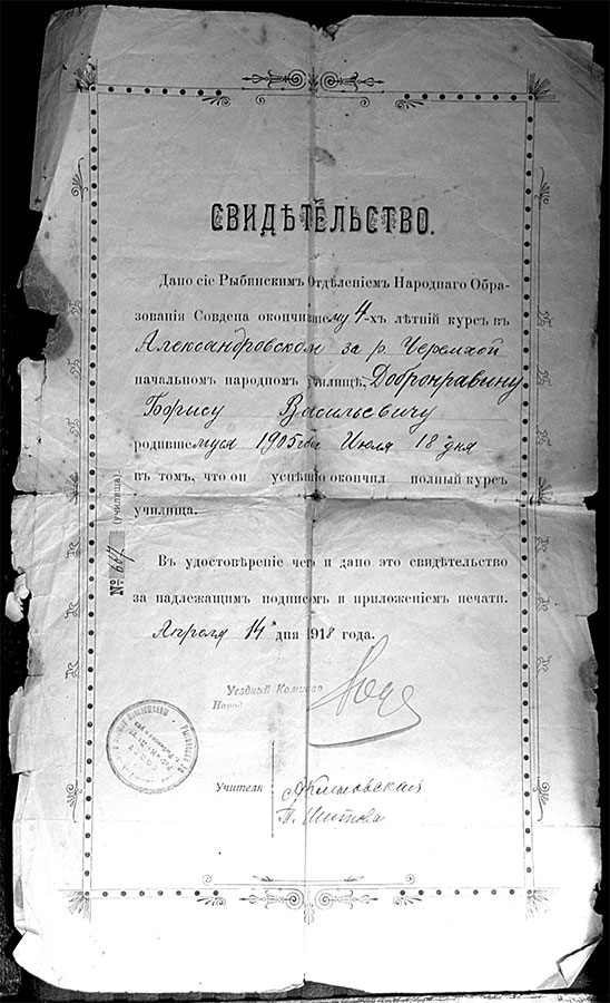 Дано сие Рыбинским отделением Народного Образования Совдепа окончившему 4-х летний курс в Александровском за р. Черемхой начальном народном училище Добронравину Борису Васильевичу родившемуся 1905 года июля 18 дня в том, что он успешно окончил полный курс училища. В удостоверение чего и дано это свидетельство за надлежащим подписом и приложением печати. Апреля 14 дня 1918 года»