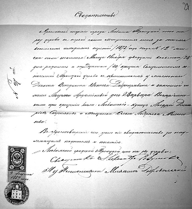«Свидетельство. Ярославской губернии города Любима Троицкой что на рву церкви в первой части метрической книги за тысяча восемьсот семьдесят третий /1873/ год под № 12 женска пола значится Месяца Ноября двадцать восьмого /28/ дня родилась и тридцатого /30/крещена Священником означенной Троицкой церкви и причетником у местного Диакона Венедикта Иоаннова Добронравина и законной его жены Августы Ардалионовой дочь Варвара. Восприемниками при крещении были Любимский купец Андрей Дмитриев Скорняков и мещанка Ольга Андреева Мельникова. В удостоверение чего дано сие свидетельство за надлежащим подписом и печатию»